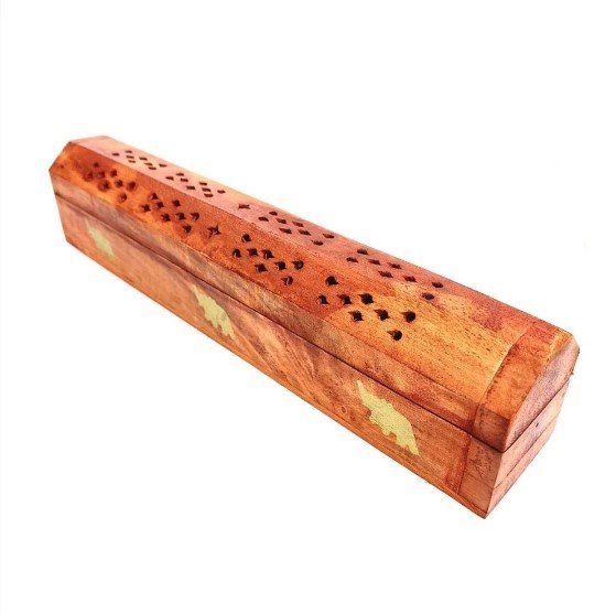 Incensario Vareta Madeira Baú 30 cm O incensário é um recipiente utilizado para a queima de substâncias aromáticas (incenso de vareta, resinas, essências) utilizada para fins diversos, de acordo com as propriedades das ervas que serão queimadas, e como oferenda aos Deuses. Este incensário possui um depósito para armenenzar incenso.