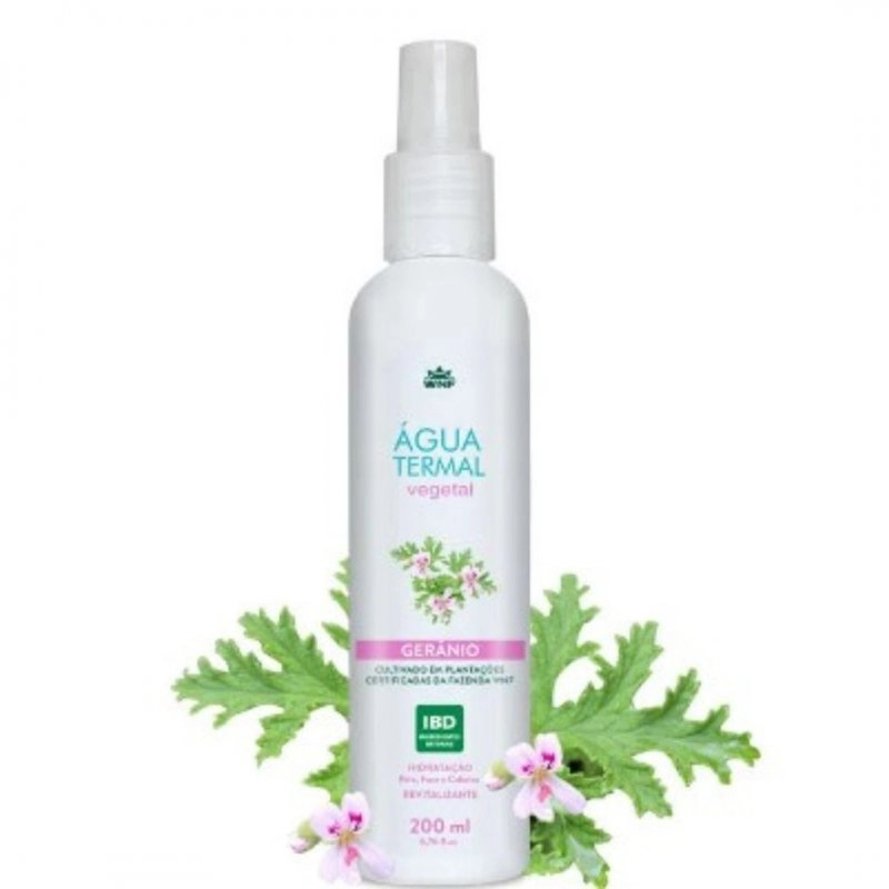 A Água Termal de Gerânio WNF é rica em sais minerais de origem vegetal como o Zinco, Fósforo, Enxofre, Silício, Telúrio, Magnésio, Cálcio, Ferro, Potássio, Sódio. Hidrata, nutre, tonifica, fortalece e equilibra a pele. Tem efeito anti-aging, antirrugas, clareador e auxilia na flexibilidade da pele. Retarda o aparecimento de rugas, estrias e manchas. É um produto hipoalergênico. Nos cabelos, hidrata e diminui o frizz. Um produto com garantia de qualidade WNF, não testado em animais e vegano. Matéria prima orgânica e natural, extraída da Fazenda das Lavandas WNF.